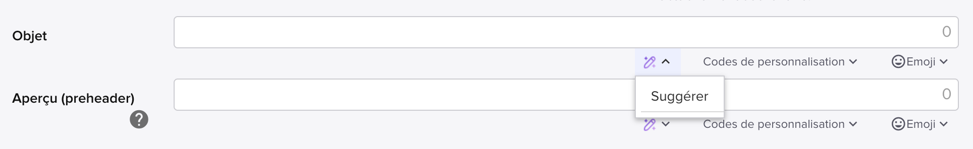- Cliquez l’icône IA (représenté par le “crayon magique”) en dessous du champ « objet », puis sélectionnez « Suggérer »