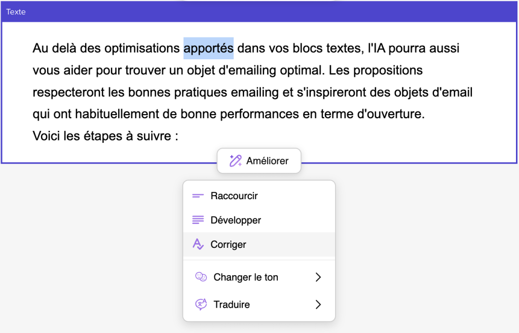 Vous pouvez corriger les textes que vous intégrez dans votre opération emailing en un clic. Voici les étapes à suivre :