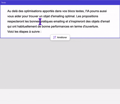 Au delà des optimisations apportées dans vos blocs textes, l'IA pourra aussi vous aider pour trouver un objet d'emailing optimal. Les propositions respecteront les bonnes pratiques emailing et s'inspireront des objets d'email qui ont habituellement de bonne performances en terme d'ouverture.